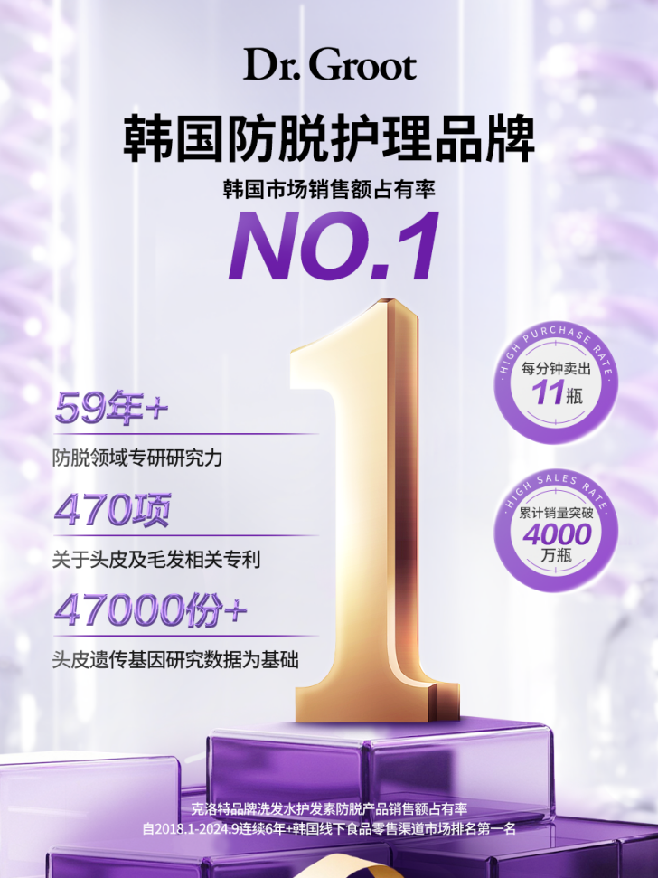 克洛特自2017年上市以来,以专业头皮护理定位迅速占领市场。据权威数据统计,其防脱系列产品在韩国线下食品零售渠道连续6年(2018-2024)销量第一,全球累计售出超4000万瓶,创造每一分钟卖出11瓶的惊人记录****。品牌依托LG生活健康的科研实力,为亚洲及全球用户提供差异化护理体验。